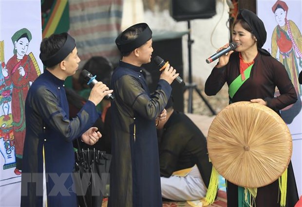 Các liền anh, liền chị trình diễn màn hát giao duyên Quan họ. Ảnh: Nhật Anh/TTXVN |