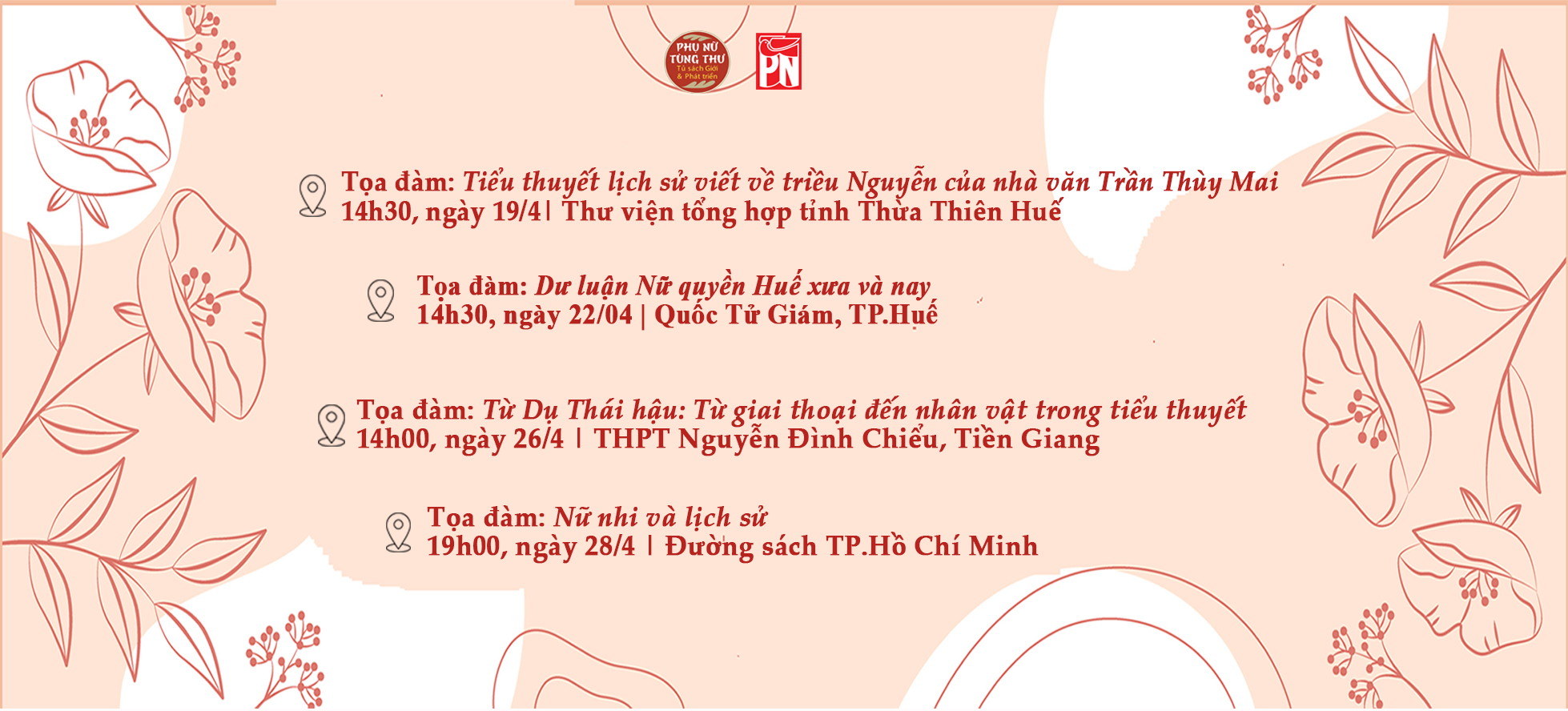 Tham gia Hội sách ở Huế do Cục Xuất bản In và Phát hành tổ chức, Nxb sẽ có hai sự kiện vào chiều 19/4 và chiều 22/4, liên quan đến hai bộ tiểu thuyết lịch sử của nhà văn Trần Thuỳ Mai (Từ Dụ Thái hậu và Công chúa Đồng xuân), và bộ sách Phụ nữ Tùng thư (giới và phát triển).