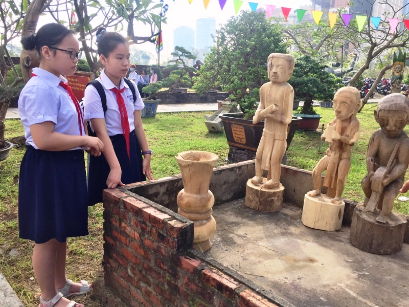 Các em học sinh xem tượng điêu khắc gỗ của người Cơ Tu tại ngày hội |