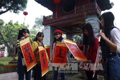 | Nhiều bạn trẻ đua nhau xin chữ may mắn đầu năm. Ảnh: TTXVN |