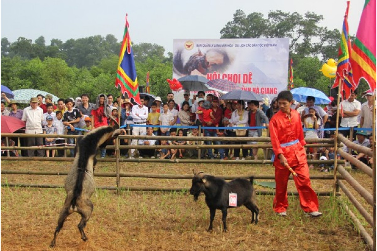| Hội chọi dê của đồng bào huyện Hoàng Su Phì (Hà Giang) được tái hiện tại Làng văn hóa các dân tộc tại Hà Nội |