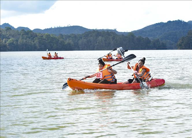 Các vận động viên đua thuyền trên hồ Pá Khoang. Ảnh; TTXVN |