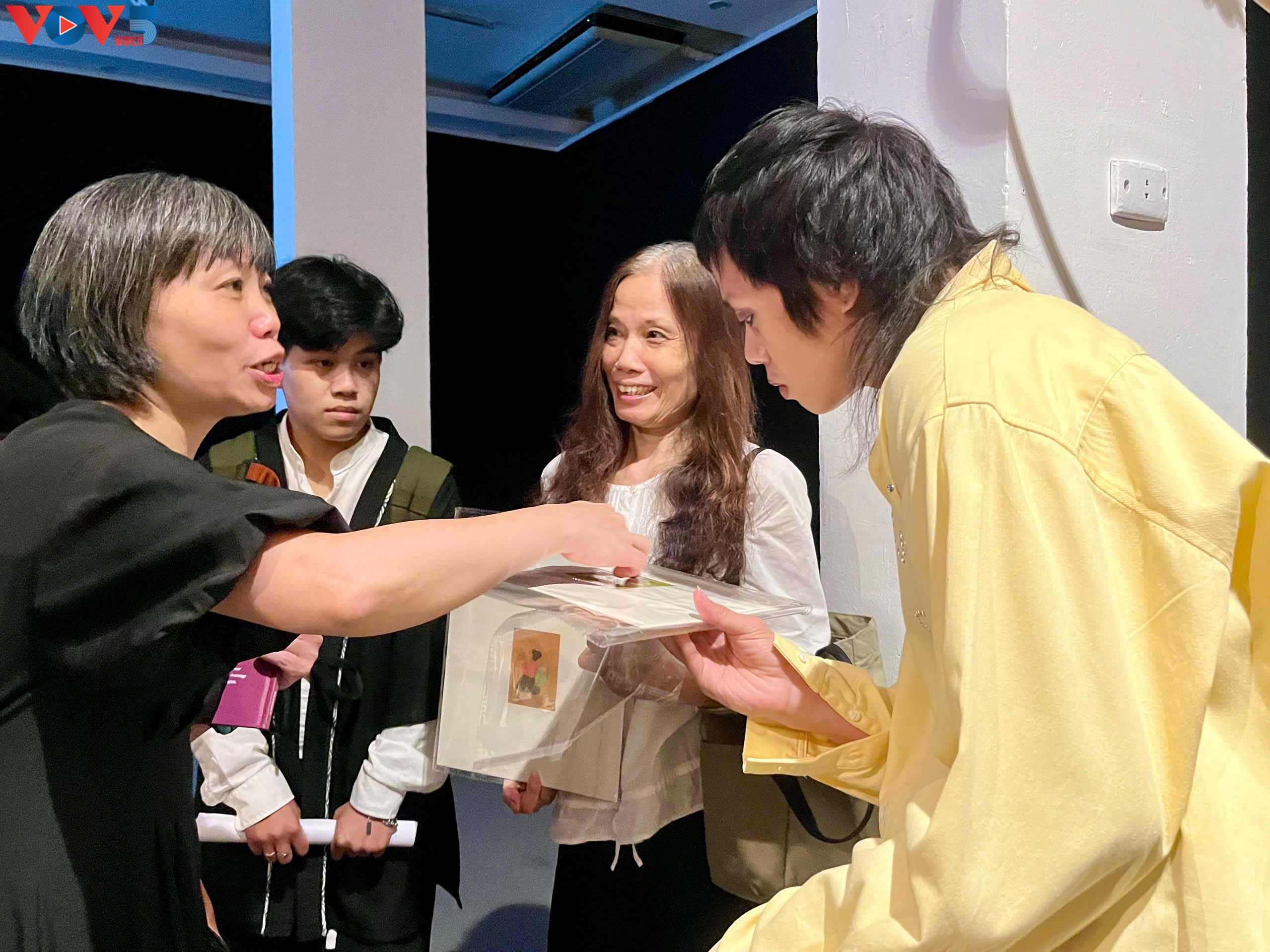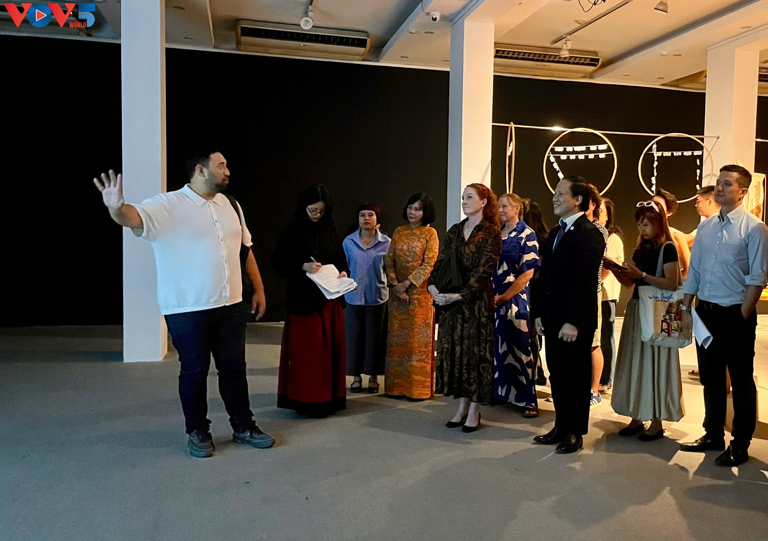 Du khách trò chuyện cùng nghệ sĩ New Zealand để hiểu hơn về tác phẩm. |