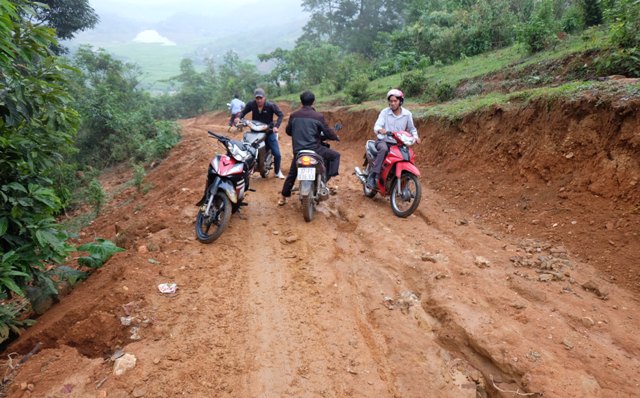 Quãng đường đến trường chỉ trong vòng gần 10 cây số, vào ngày trời nắng thì không trở ngại nhưng mưa xuống, những chiếc xe số bình thường phải quấn xích vào bánh, một số thầy phải dùng xe phân khối lớn như Win. Ủng cao su, áo mưa là đồ bảo hộ không thể thiếu với các thầy. Thầy giáo Thò Bá Trù, người Mông ở xã Tri Lễ, dạy ở điểm trường Huổi Mới 2 cho biết khoảng 4 năm nay các thầy mới đi được xe máy vào trường, còn trước đó toàn đi bộ, men theo con đường mòn của người dân: “Do con đường đi khó khăn quá, các cô không đi được mà chỉ có các thầy đảm bảo sức khỏe mới đi được. Mặc dù các cô cũng muốn nhưng quả là khó khăn. Từ nhà tôi lên trường khoảng 7km phải đi mất hơn 1 tiếng vì đường đi lại khó. 1 tháng xe máy phải đem đi sửa 1, 2 lần. Nhiều bộ phận của xe hỏng rất nhanh. Lốp xã thì 2 tháng thay một lần, còn phanh 1 tháng thay một lần, riêng vành và côn thì cũng thay liên tục”.
