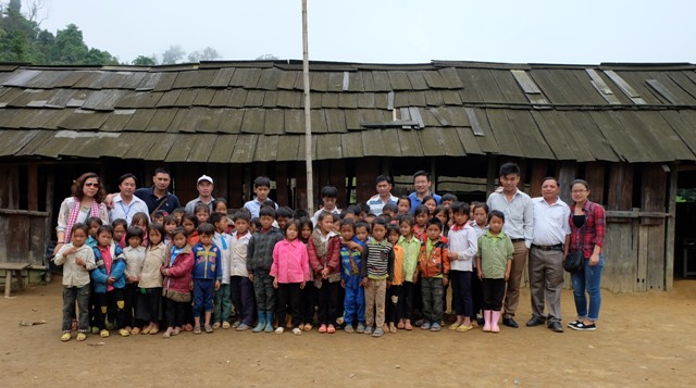 | Đoàn phóng viên của VOV chụp cùng các thầy cô giáo và học sinh tại điểm trường Huổi Mới 2 |