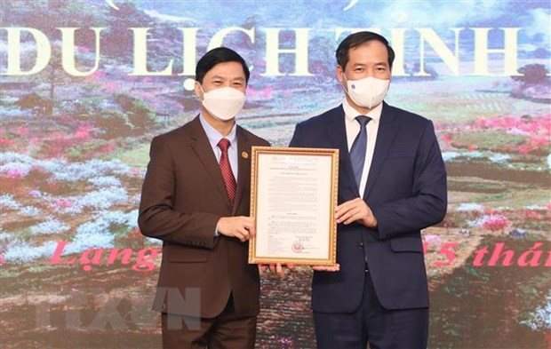 Trao Quyết định công nhận của UBND tỉnh Lạng Sơn về Biểu trưng và Khẩu hiệu du lịch tỉnh Lạng Sơn. Ảnh: Anh Tuấn/TTXVN |
