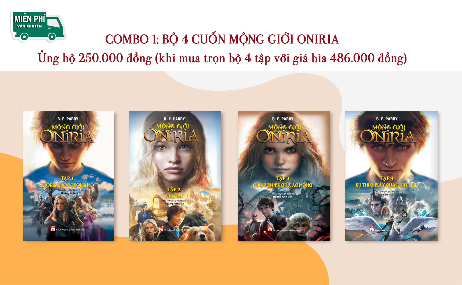 Bộ sách được bán đợt này là 2 hoặc đủ bộ 4 tập 𝑴𝒐̣̂𝒏𝒈 𝒈𝒊𝒐̛́𝒊 𝑶𝒏𝒊𝒓𝒊𝒂, xêri kỳ ảo hấp dẫn của nữ tác giả người Pháp, B. F. Parry. Với trí tưởng tượng phong phú và ngòi bút đầy mê hoặc của mình, cô đã đưa độc giả theo chân cậu bé Eliott đến một xứ sở vô cùng đặc biệt: Mộng giới Oniria - vương quốc của những giấc mơ, nơi mỗi chúng ta vẫn ghé thăm hằng đêm trong khi ngủ dù không hề hay biết. Với những tình huống gay cấn, bất ngờ và hồi hộp đến thót tim, tác giả B.F. Parry tự nhiên và khéo léo dẫn dắt người đọc phiêu lưu vào xứ sở nhiệm màu của Mộng giới và cùng Eliott khám phá những tiết lộ chấn động đến không ngờ.