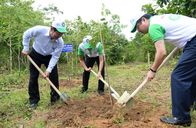 | Ông Huỳnh Vĩnh Ái, Thứ trưởng Bộ VHTT&DL cùng ông Nguyễn Thanh Nghị, Bí thư Tỉnh ủy Kiên Giang trồng cây xanh phát động chiến dịch du lịch xanh Phú Quốc 2016. Ảnh: tuoitre. |