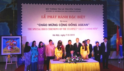Nhân kỷ niệm 48 năm ngày thành lập ASEAN (8/8/1967-8/8/2015), sáng nay (7/8) tại Hà Nội, Bộ Thông tin và Truyền thông, Tổng công ty Bưu điện Việt Nam tổ chức phát hành bộ tem đặc biệt “Chào mừng Cộng đồng ASEAN”. Bộ tem thể hiện rõ định hướng “Một tầm nhìn, một bản sắc, một cộng đồng” mà ASEAN đang hướng đến. Mẫu tem là quốc kỳ của 10 nước thành viên ASEAN, được kết thành hình bông hoa 5 cánh đặt trên hai bàn tay nắm chặt vào nhau, cùng nền trời xanh, đôi chim bồ câu và những bông lúa trĩu vàng. Trung tâm chính của mẫu tem là logo bó lúa, biểu trung cho cộng đồng ASEAN. Họa sỹ Vũ Kim Liên, người đạt giải nhất cuộc thi sáng tác mẫu tem ASEAN, cho biết: “Với ý tưởng thiết kế làm sao nổi bất được 3 chủ đề của ASEAN trong tương lai là một tầm nhìn, một bản sắc, một cộng đồng. Trong đó, phải thiết kế làm sao thể hiện được nội dung chính là một cộng đồng và phải nêu bật được quốc gia đó. Xuất phát từ ý tưởng này tôi đã chọn lá cờ của các nước, kết thành một bông hoa để thể hiện được tính cộng đồng, sự đoàn kết của 10 nước ASEAN trong tương lai”.