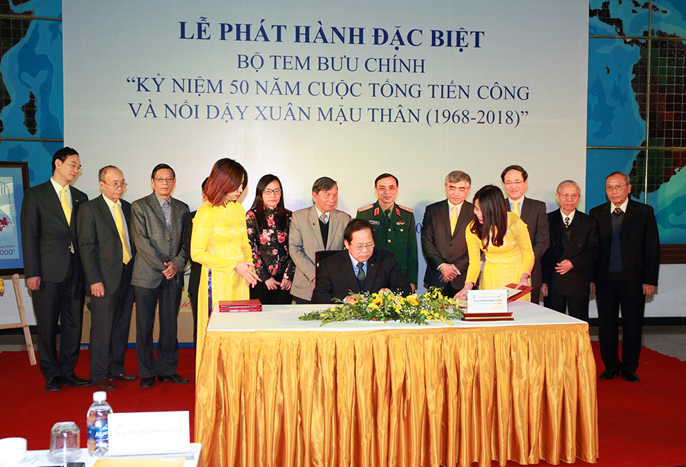 Chiều 8/2, tại Hà Nội, Tổng Công ty Bưu điện Việt Nam phát hành bộ tem đặc biệt “Kỷ niệm 50 năm cuộc Tổng tiến công và nổi dậy Xuân Mậu Thân 1968”. Bộ trưởng Bộ Thông tin và Truyền thông Trương Minh Tuấn đã ký và đóng dấu lên mẫu tem mới phát hành.