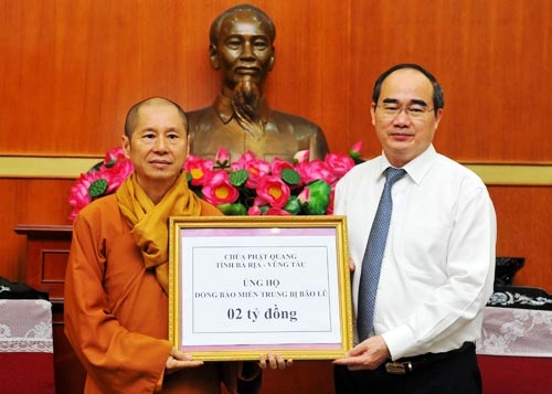 Chiều 26/10, tại Hà Nội, Chủ tịch Ủy ban Trung ương Mặt trận Tổ quốc Việt Nam Nguyễn Thiện Nhân tiếp nhận số tiền 2 tỷ đồng ủng hộ đồng bào miền Trung bị bão lũ do Hoà thượng Thích Chân Quang, trụ trì chùa Phật Quang, tỉnh Bà Rịa- Vũng Tàu dẫn đầu đoàn đại biểu Phật giáo trao.