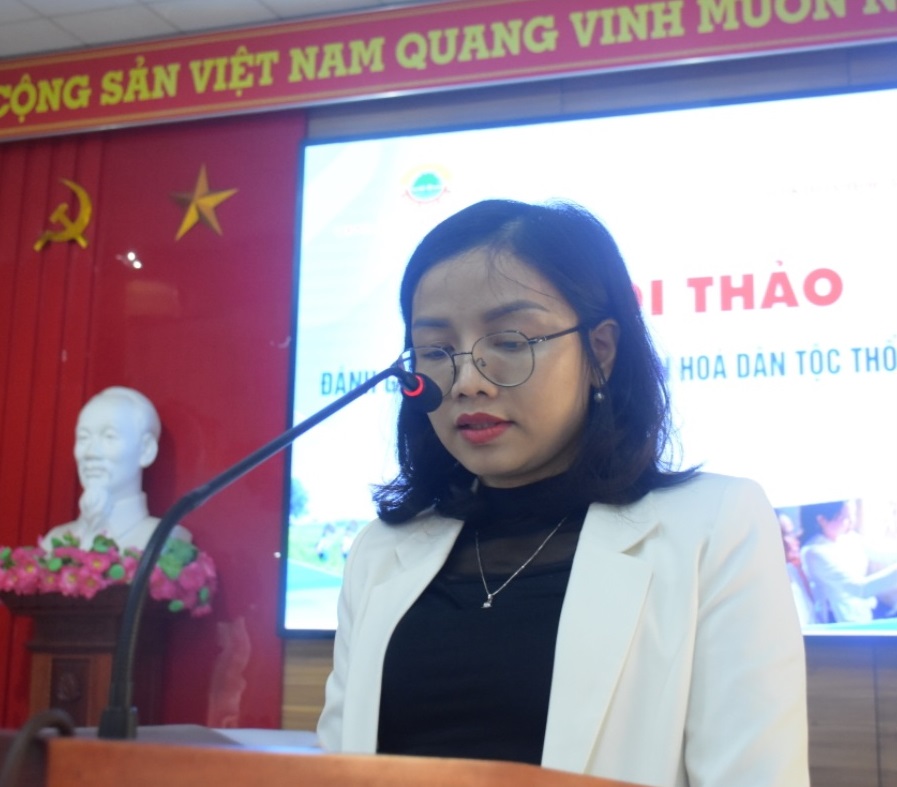 TS. Lê Thị Hiếu, Trung tâm Khoa học, xã hội và nhân văn, Sở Khoa học và Công nghệ Nghệ An, báo cáo tóm tắt “Xây dựng mô hình du lịch văn hoá dân tộc Thổ góp phần phát triển kinh tế - xã hội huyện Nghĩa Đàn”. Ảnh: Lan Phương |