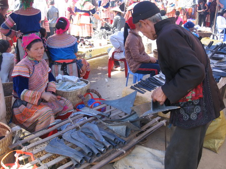 Không chỉ lương thực, thực phẩm đắt hàng mà các dụng cụ như bừa, lưỡi cày, dao cũng rất đắt hàng. Với người dân vùng cao các dụng cụ phục vụ cho việc sản xuất đóng một vai trò quan trọng nên họ muốn năm mới được dùng những nông cụ mới. Sau một hồi chọn lựa, anh Vàng Văn Lồ, người Tày ở Na Hối cũng đã chọn được một cái: “Ưng ý thì mới mua. Làm thế mới thắng lợi. Đi cày nương cày ruộng, năm mới phải dùng cái mới. Ngoài ra còn mua nhiều thứ đấy, mua quần áo, giầy dép cho con cái. Thức ăn thì ở nhà khắc nuôi được.”