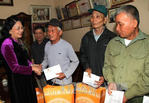 | Phó Chủ tịch nước Đặng Thị Ngọc Thịnh đến thăm, tặng quà các hộ gia đình chính sách ở xã Việt Lâm, huyện Vị Xuyên. (Ảnh: Thông tấn xã Việt Nam) |