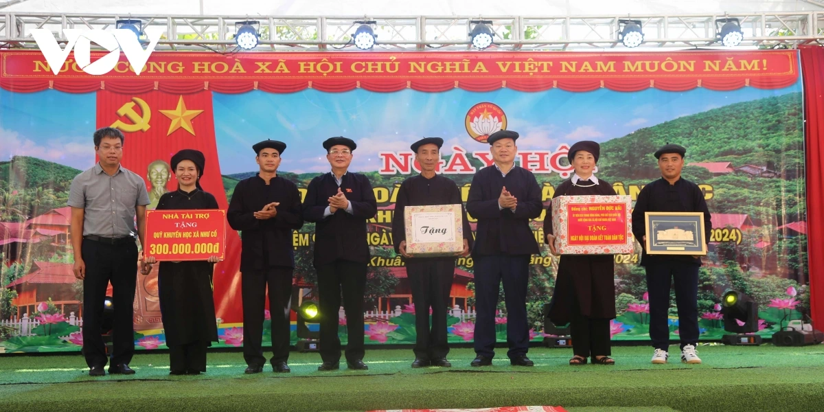 Phó Chủ tịch Quốc hội Nguyễn Đức Hải tặng quà nhân dân Khuân Bang.Ảnh: Công Luận/VOV-Đông Bắc |