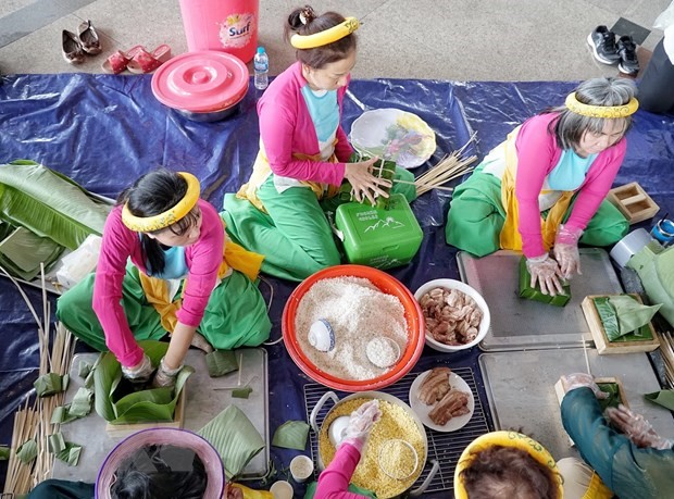 Đội thi đến từ quận 5 tham gia 'Hội thi Gói, nấu bánh Chưng dâng cúng Quốc Tổ' lần thứ 3 năm 2021 - Ảnh: Thu Hương/TTXVN |