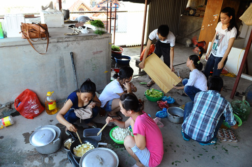 | Mỗi người một chân một tay từ rán đậu, bóc tỏi, rửa rau, thái mộc nhĩ, rang lạc, băm thịt... Ai cũng tỏ ra háo hức và nhiệt tình với công việc. |