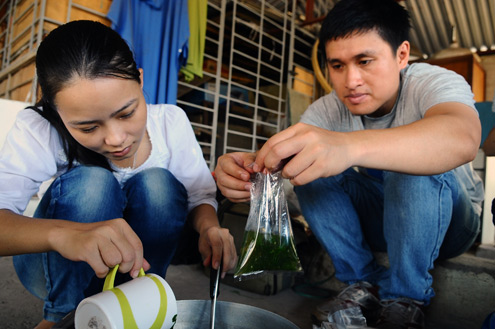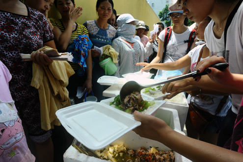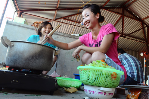 | Nhóm hoạt động được hơn 2 tháng. Ban đầu trưởng nhóm vận động người thân và bạn bè. Mỗi người góp một thứ như bếp ga, gạo, rau, chất đốt... Ngoài ra mỗi tuần có những tình nguyện viên cũng tìm đến xin góp sức. Các bạn trẻ hầu hết đều đã tốt nghiệp đại học và có việc làm. "Mỗi người mỗi ngành, xuất phát từ cái tâm hướng thiện mà tìm đến đây", Huyền Trang (áo hồng), một diễn viên belly dance chia sẻ. |