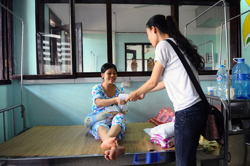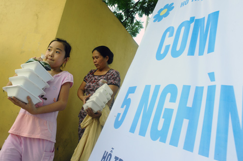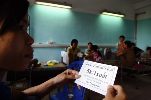 | Trong lúc mọi người nấu nướng thì một cô gái được cắt cử nhiệm vụ đi phát phiếu mua cơm cho các bệnh nhân, thường là người có hoàn cảnh khó khăn. Chỉ những người có phiếu này mới được mua cơm giá 5.000 đồng. |