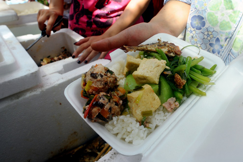 Mỗi trưa thứ bảy, suất cơm nóng hổi với đầy đủ các món thịt, cá, rau, canh được một nhóm bạn trẻ ở Hà Nội bán giá 5.000 đồng cho trẻ em và người nhà bệnh nhân trước cửa Viện Nhi trung ương.