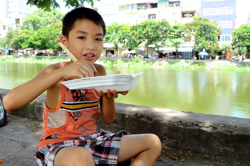 | Cậu bé quê Hải Phòng, Nguyễn Văn Giáp (8 tuổi) ngồi ngay cổng bệnh viện "đánh bay" suất cơm trong ít phút và khen rất ngon. |