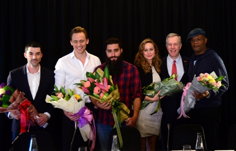| Từ trái qua: Nhà sản xuất Alex Garaia, nam diễn viên Tom Hiddleston, đạo diễn Jordan Vogt-Roberts, nữ diễn viên Brie Larson, Đại sứ Mỹ tại Việt Nam - Ted Osious và nam diễn viên Samuel L. Jackson (Ảnh: thethaovanhoa.vn) |