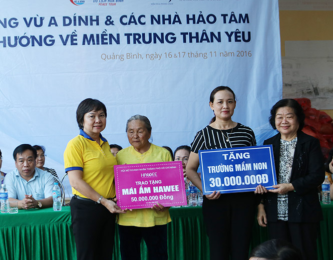 Số quà trao tặng người dân vùng lũ tỉnh Quảng Bình được trích từ nguồn Quỹ học bổng Vừ A Dính, Quỹ từ thiện PNJ, Công ty Cổ phần Du lịch Hòa Bình, Hội Nữ doanh nhân TP Hồ Chí Minh với mong muốn giúp bà con vùng lũ sớm vượt qua khó khăn.