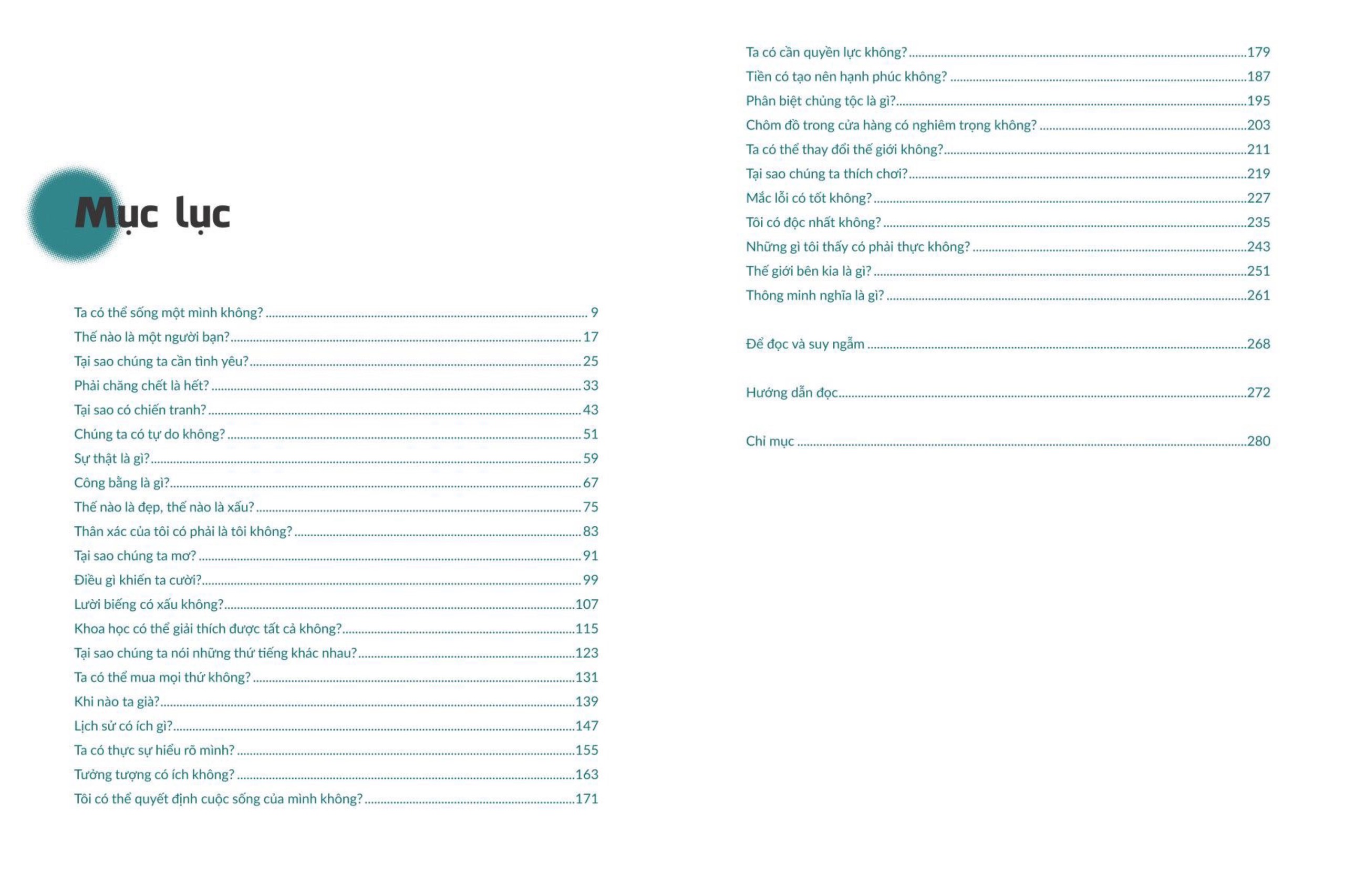 Với mỗi câu hỏi, Yves Michaud đưa ra một vài tác phẩm khuyên đọc, bao gồm những tác phẩm kinh điển có bàn đến chủ đề đó như Tổ tiên của chúng ta (Italo Calvino), Hóa thân (Franz Kafka), Kẻ ngoại cuộc (Albert Camus), Những cuộc phiêu lưu của Huckleberry Finn (Mark Twain), Chúa Ruồi (William Golding), Chân dung của Dorian Gray (Oscar Wilde), Hoàng tử bé (Antoine de Saint-Exupéry), Đại gia Gatsby (F. Scott Fitzgerald),...