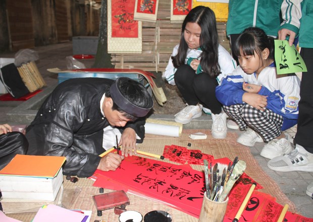 Học sinh xin chữ ông đồ tại Không gian chợ Tết xưa. Ảnh: Thùy Dung/TTXVN |