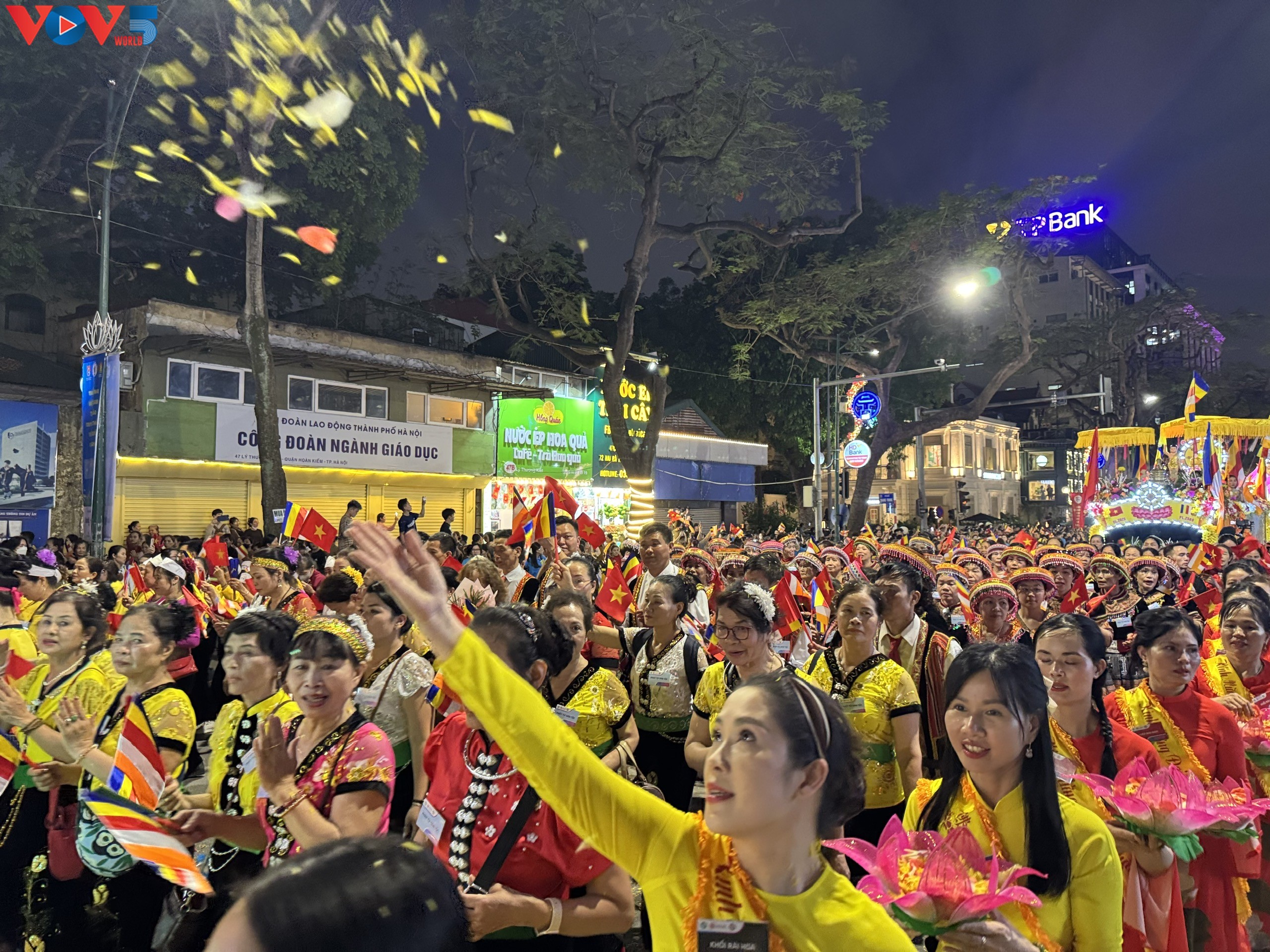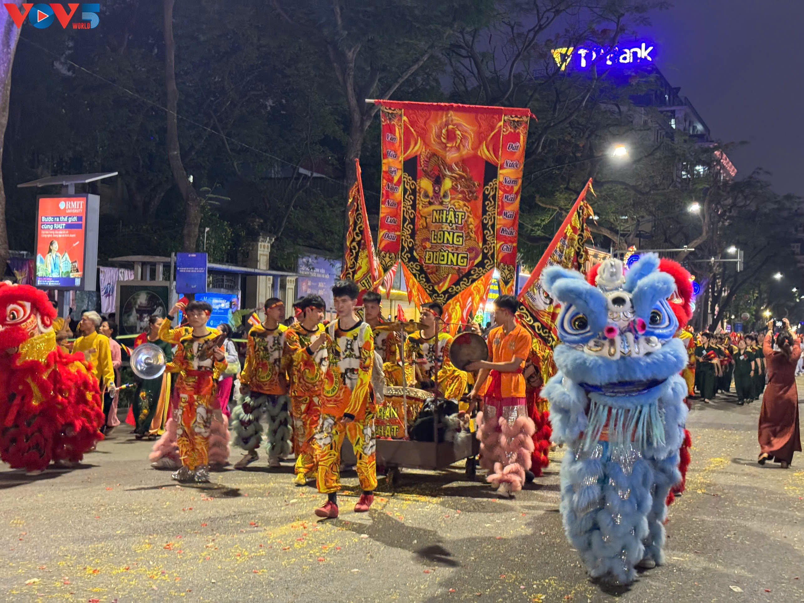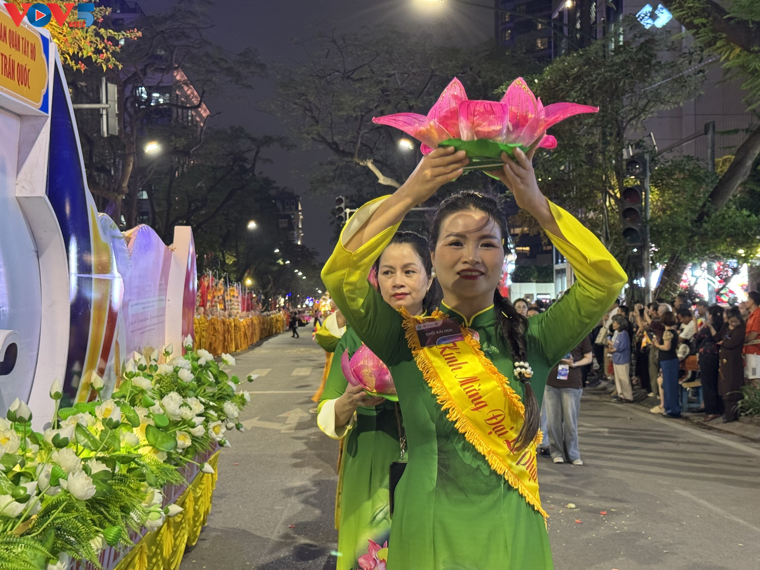 Các nữ Phật tử trong trang phục áo dài truyền thống, tay nâng đèn hoa sen, tạo nên không khí trang nghiêm và rực rỡ sắc màu trên đường phố Hà Nội. Ảnh: Lê Huy |