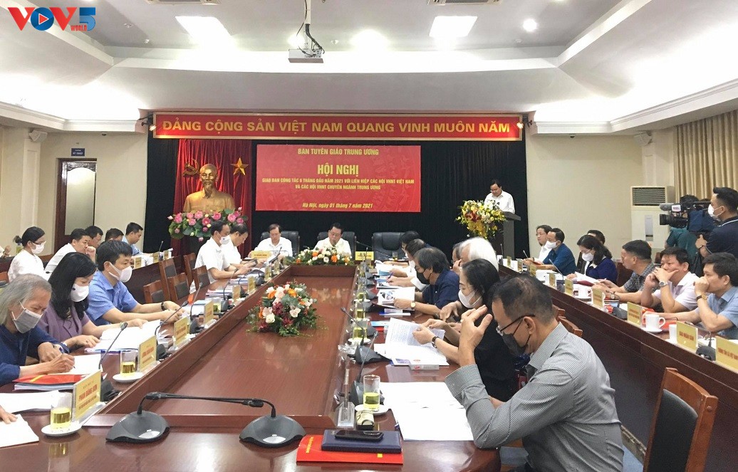 (VOV5) - “Tiếp tục quan tâm, đào tạo bồi dưỡng lực lượng văn nghệ sĩ của đất nước, đẩy mạnh hơn nữa để tạo đột phá hình ảnh của Việt Nam trên trường quốc tế trong lĩnh vực văn hóa nghệ thuật”. Đây là ý kiến chỉ đạo của Bí thư Trung ương Đảng, Trưởng Ban Tuyên giáo Trung ương Nguyễn Trọng Nghĩa tại Hội nghị giao ban công tác 6 tháng đầu năm 2021 với Liên hiệp các hội Văn học nghệ thuật Việt Nam và các Hội Văn học nghệ thuật chuyên ngành Trung ương được tổ chức hôm nay tại Hà Nội.