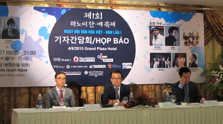 | Ông Ko Sang Goo (giữa) và ông Park Nark Jong (trái) thông tin tại buổi họp báo. Ảnh: qdnd.vn |