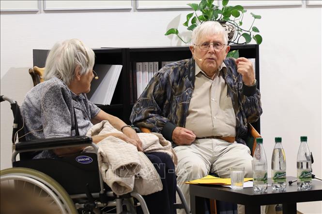 Tiến sỹ Erhard Scherner cùng vợ là Tiến sĩ Helga Scherner giới thiệu về cuốn sách "Nhật ký trong tù" bản tiếng Đức. Ảnh: Mạnh Hùng- P/v TTXVN tại Đức |