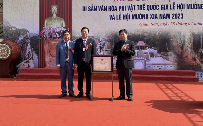 Ông Nông Quốc Thành, Phó Cục trưởng Cục di sản văn hóa trao chứng nhận Di sản văn hóa phi vật thể Lễ hội Mường Xia cho huyện Quan Sơn. Ảnh:tienphong.vn |
