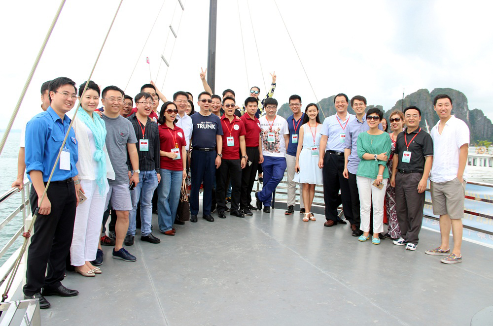 | hanh niên 2 nước Việt Nam - Trung Quốc chụp ảnh lưu niệm trên tàu khi tham quan Vịnh Hạ Long. Ảnh: Vũ Đức |