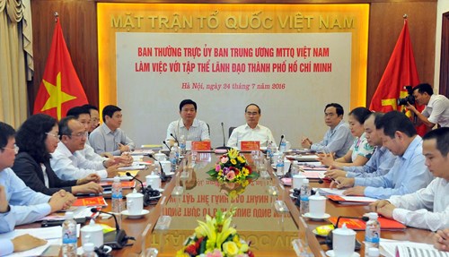 Chiều 24/7, tại Hà Nội, Chủ tịch Ủy ban Trung ương Mặt trận Tổ quốc Việt Nam Nguyễn Thiện Nhân làm việc với lãnh đạo thành phố Hồ Chí Minh bàn giải pháp phát phát triển nhanh, mạnh hơn với mô hình đô thị thông minh.