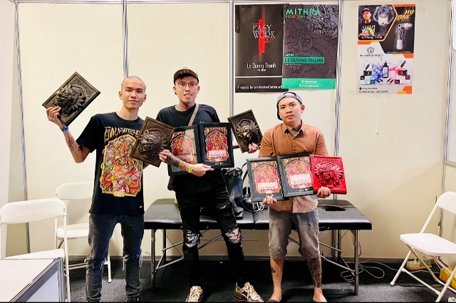 Lê Dương Thanh (người đứng giữa) và đội “LA tattoo family” tại cuộc thi Bali Tattoo Expo 2022 |