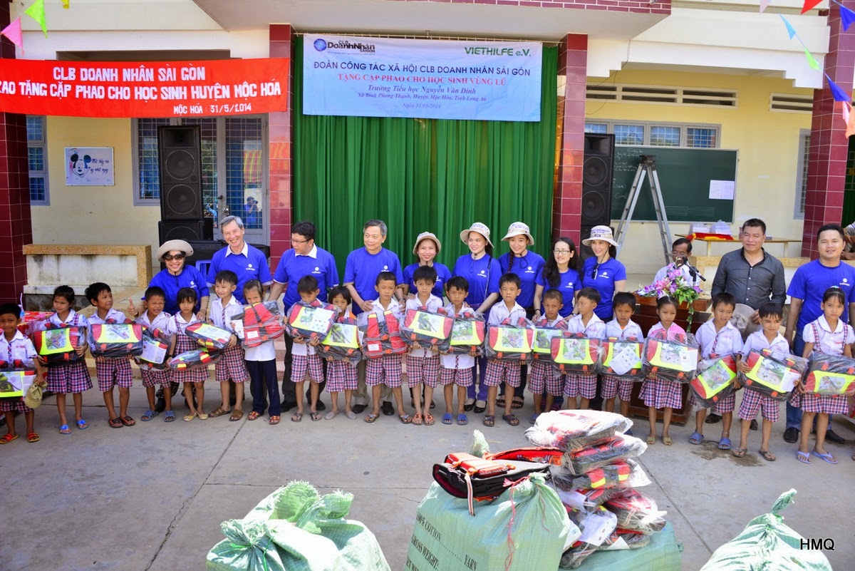 Đoàn Công tác Xã hội CLB Doanh nhân Sài Gòn đến thăm và trao cặp phao cho học sinh trường tiểu học Nguyễn Văn Dinh tại Mộc Hóa - Long An