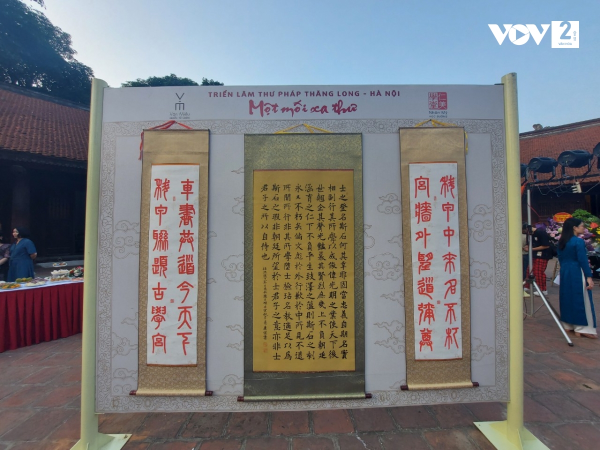 Triển lãm quy tụ hơn 100 tác phẩm thư pháp Hán, Nôm và Quốc ngữ của 100 nhà hoạt động thư pháp trên khắp mọi miền đất nước và quốc tế. Các tác phẩm ca ngợi truyền thống tôn sư trọng đạo, tuyển chọn hiền tài, gắn với Trung tâm giáo dục Văn Miếu - Quốc Tử Giám, tả cảnh đẹp thanh bình của các di tích lịch sử, tư tưởng an bang định quốc của các danh Nho, danh thần lịch đại.