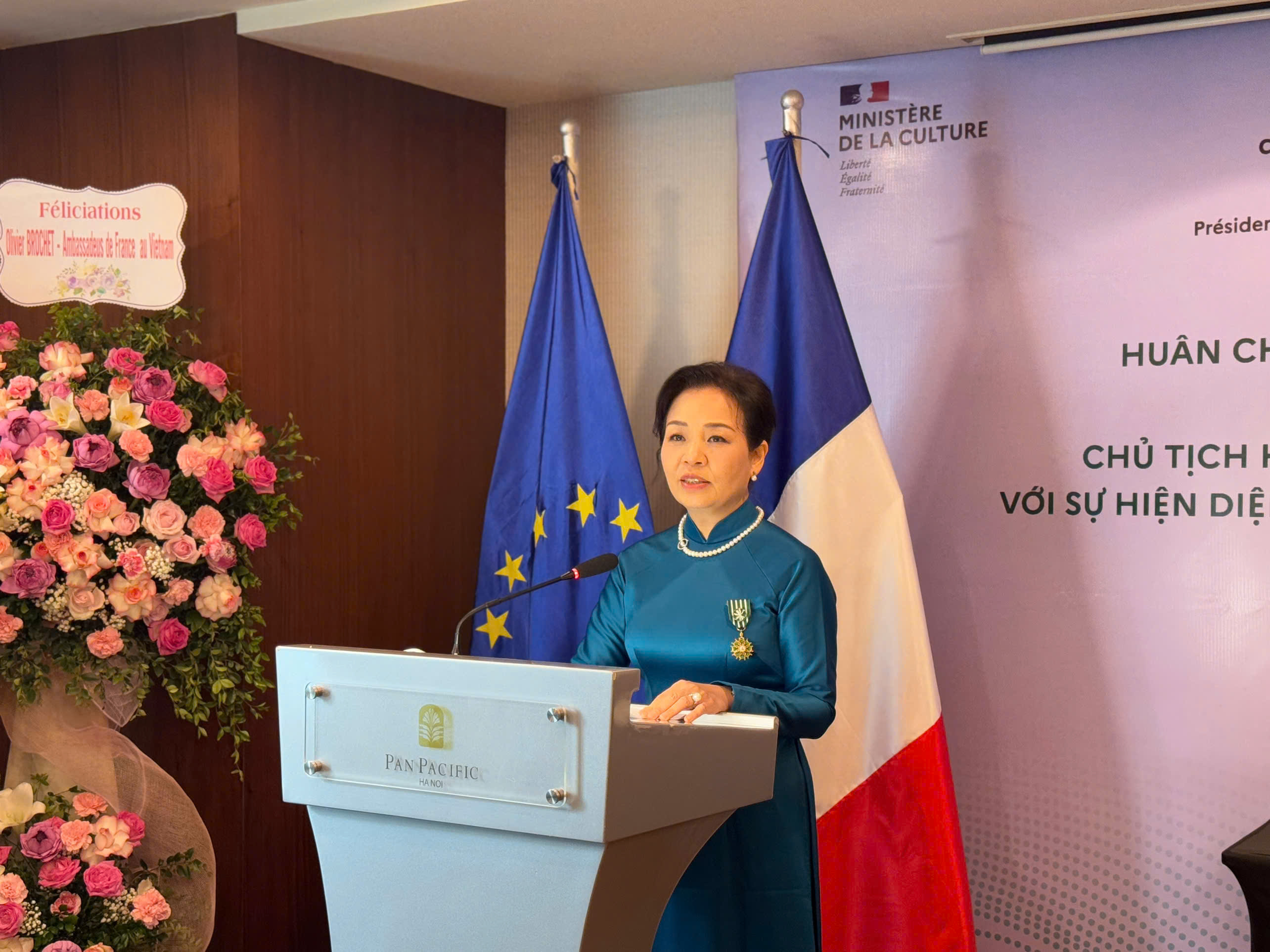 Bà Rachida Dati, Bộ trưởng Văn hoá Pháp trao Huân chương cho Tiến sĩ Ngô Phương Lan. Ảnh: Lê Huy |