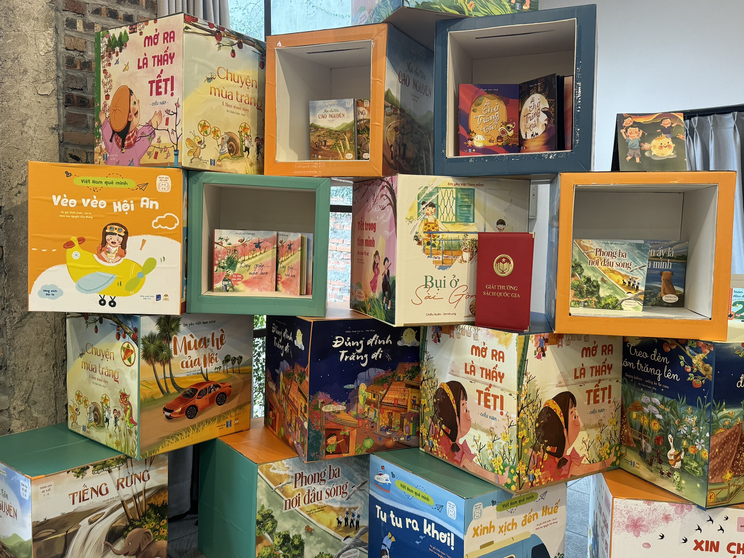 Đặc biệt, với thiết kế sắp đặt độc đáo, triển lãm được chia thành những không gian cộng hưởng, giúp phụ huynh và trẻ nhỏ cùng tương tác, chia sẻ những câu chuyện thú vị về ngôn ngữ và văn hóa Việt Nam. Ấn tượng trước cách trưng bày tinh tế này, chị Nguyễn Thùy Vân, đến từ Phú Thọ cho biết: “Đây là sự kiện rất ý nghĩa, mọi thứ rất gần gũi. Thông qua những workshop, qua chương trình đọc sách và những hình ảnh hay cách bài trí trong buổi triển lãm cho mình cảm giác như được trở về với tuổi thơ. Mình có đặt một số đầu sách cho bé, ấn tượng với bộ sách “bốn mùa xuân hạ Thu Đông”, bộ sách “Cảm xúc của em”, mình thấy là một trong những bộ sách rất phù hợp, giúp cho các con phát triển về mặt tư duy cảm xúc trong những năm đầu đời, sách cũng mang đậm sắc văn hóa của người Việt mình và tôn vinh vẻ đẹp giá trị sâu sắc của tiếng Việt của Việt Nam mình".