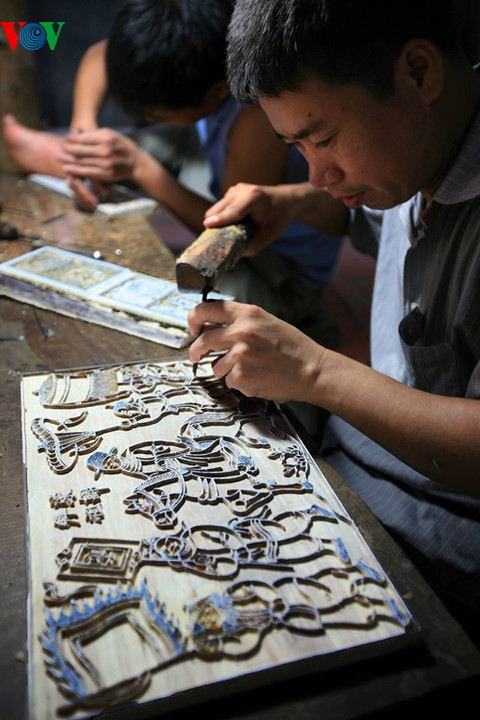 | Ván tranh khắc âm bản "Vinh Quy Bái Tổ " của dòng tranh Đông Hồ trên gỗ thị. (Ảnh: Lê Bích) |