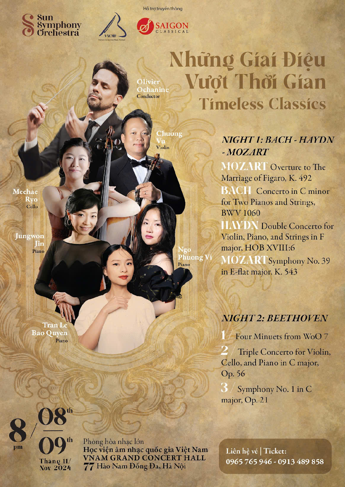 Vào hai đêm 8 và 9/11 tới, tại Phòng hòa nhạc lớn Học viện âm nhạc quốc gia Việt Nam ở Hà Nội sẽ diễn ra chuỗi hòa nhạc “Timeless Classics - Những giai điệu vượt thời gian”. Chương trình do Sun Symphony Orchestra cùng Liên hoan âm nhạc Vietnam Connection (VNCMF) tổ chức.