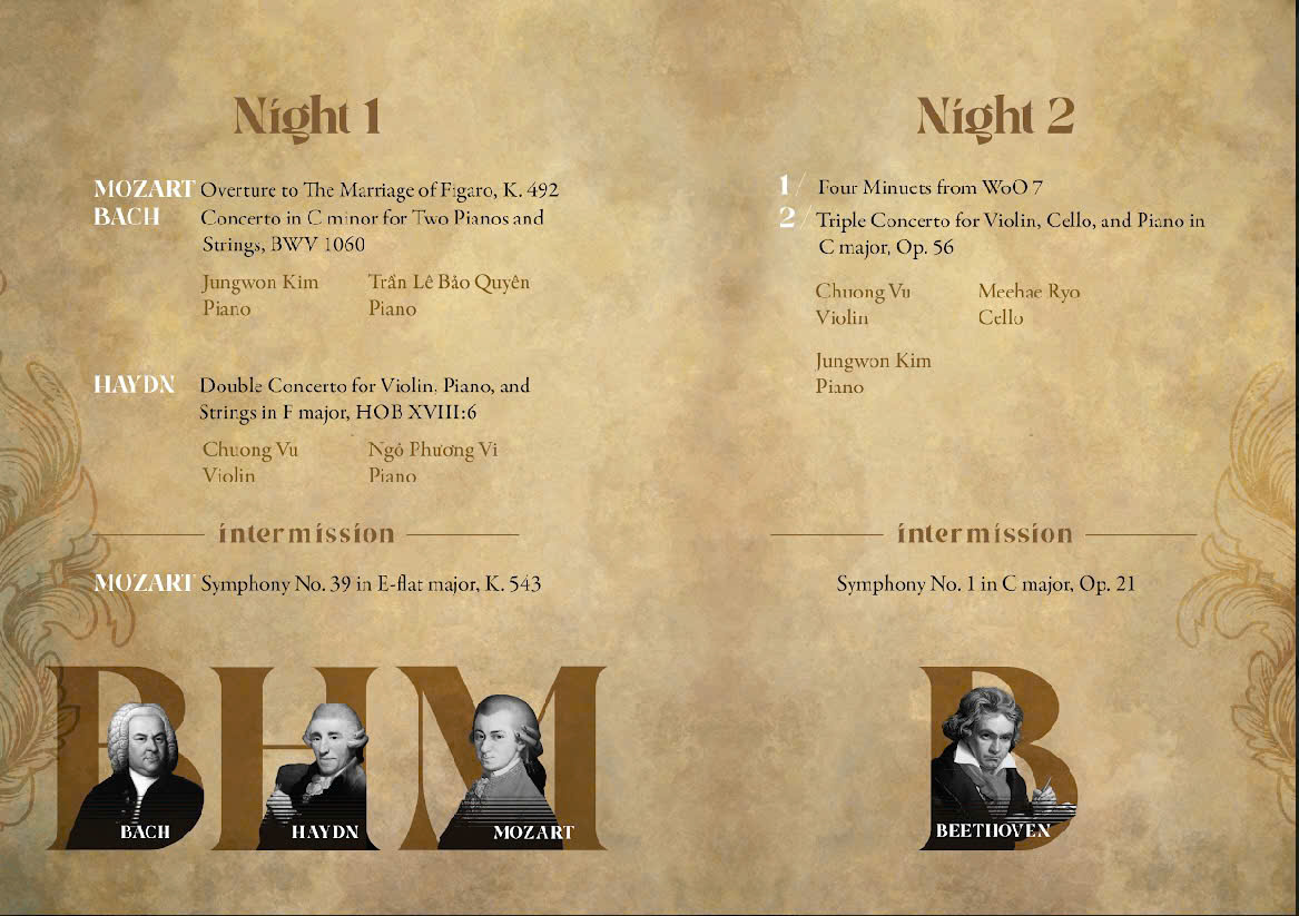 Các tác phẩm trình diễn trong hai đêm của chuỗi hòa nhạc sẽ đưa người xem bước vào một hành trình khám phá những tác phẩm âm nhạc kinh điển thời kỳ Baroque và Cổ điển, của những nhà soạn nhạc đã định hình nên nền tảng quan trọng cho lịch sử âm nhạc, gồm Bach, Haydn, Mozart và Beethoven.