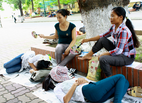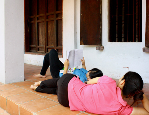| Ở Mai Động nhưng hai mẹ con này không về nhà mà nghỉ trưa ngay trong khuôn viên Đại học Sư phạm. Người mẹ cố ý nằm chống cao người để che bớt ánh sáng cho con. |