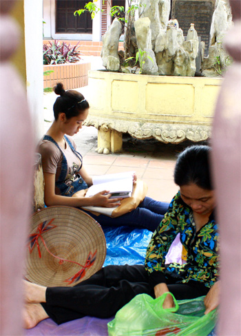 | Cả buổi sáng bà Phương (Nam Định) quét sân chùa Thánh Chúa (trong khuôn viên Đại học sư phạm Hà Nội). Khảo sát hết mọi nơi trong chùa cuối cùng bà tìm được một chỗ nghỉ lý tưởng ở ngay cổng chùa để con gái Trần Thu Hương thi xong có thể tập trung "nạp" thêm kiến thức. |