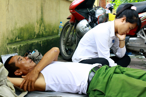 | Cả buổi trưa, ông Nguyễn Xuân Lữ (48 tuổi) để con gái gối lên đùi, vừa quạt vừa vuốt tóc cho con ngủ. Nhà ở Thái Bình nhưng ông lại công tác trên Hà Nội, ít có thời gian ở nhà với con cái. Tuy vậy, mỗi lần về cô con gái đã 18 tuổi này vẫn đòi ngủ cùng bố. |