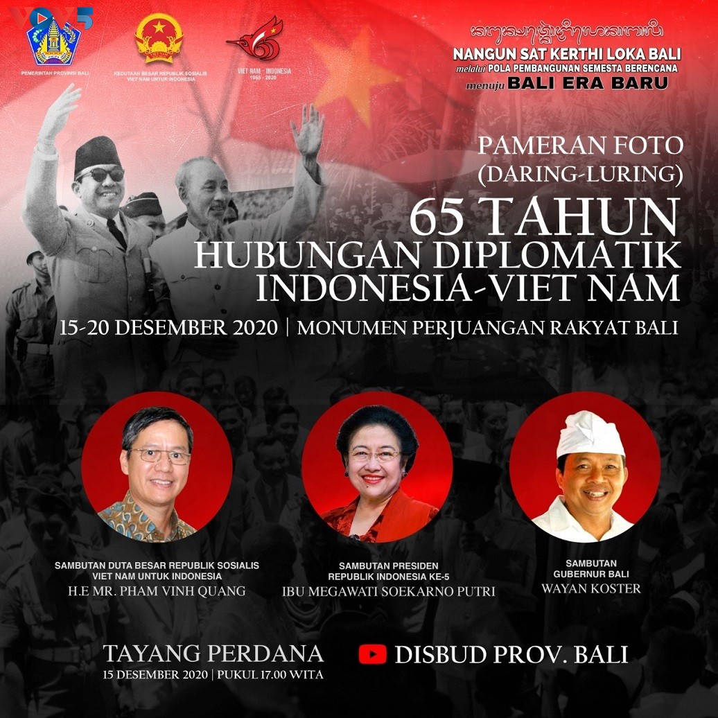 230 tấm ảnh được trưng bày tại các “phòng triển lãm ảo” theo các chủ đề như chuyến thăm của Chủ tịch Hồ Chí Minh và Tổng thống Soekarno năm 1959, chặng đường phát triển quan hệ hai nước qua 65 năm và loạt ảnh giới thiệu quảng bá về văn hóa, lịch sử, hình ảnh, đất nước của Việt Nam. Trong đó có 42 bức ảnh lịch sử đã được triển lãm trực tiếp tại Tượng đài Đấu tranh Nhân dân Bali.