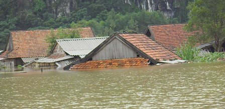 | Nước lũ làm nhà dân ở Tân Hóa, Quảng Bình ngập gần tới nóc nhà.Ảnh: báo sggp |