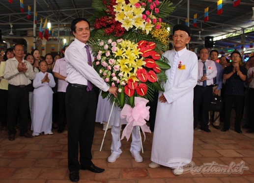 | Phó Chủ tịch UBTƯ MTTQ Việt Nam Lê Bá Trình tặng lẵng hoa chúc mừng Đại lễ. - Ảnh: Báo Đại đoàn kết |